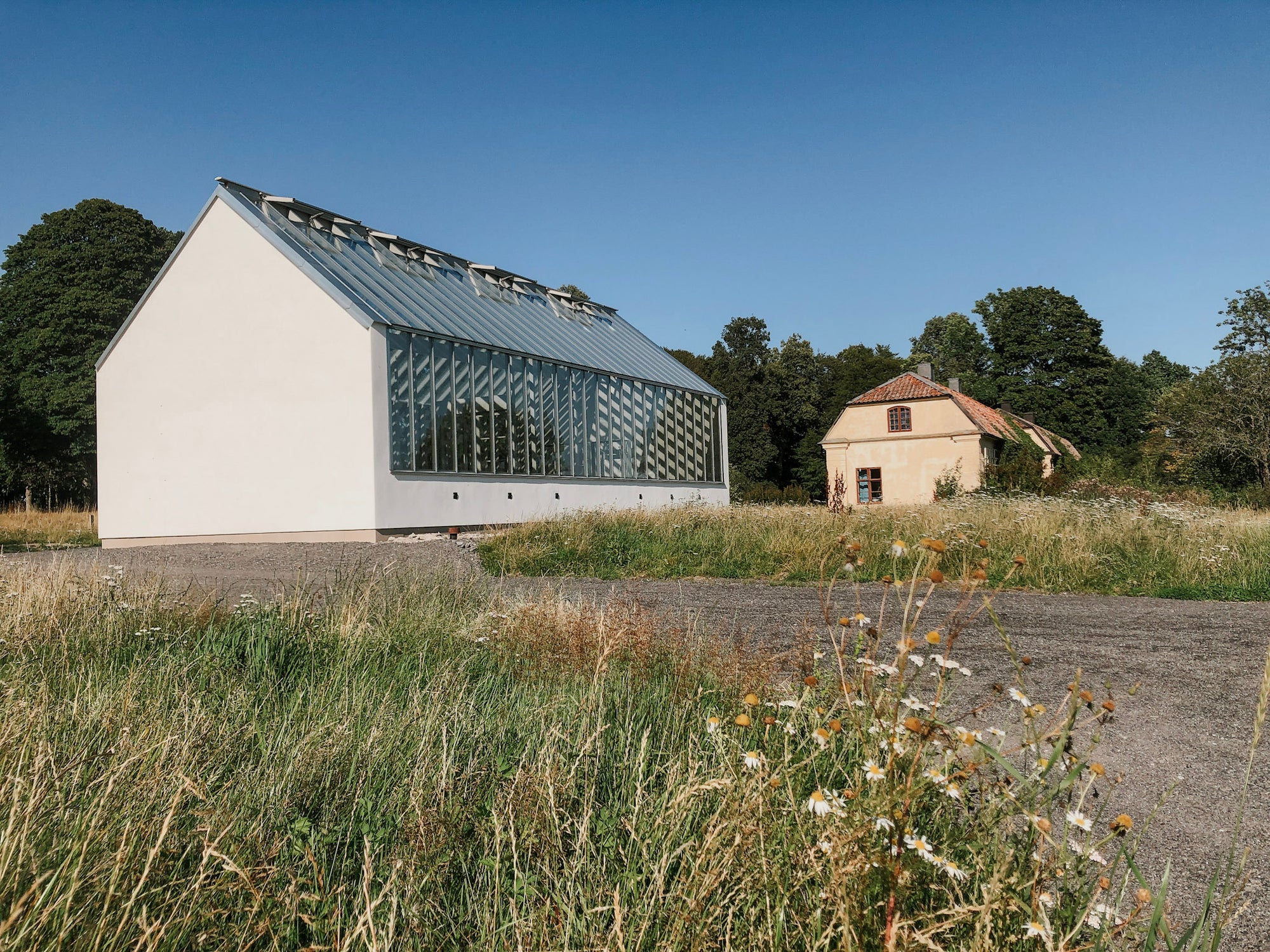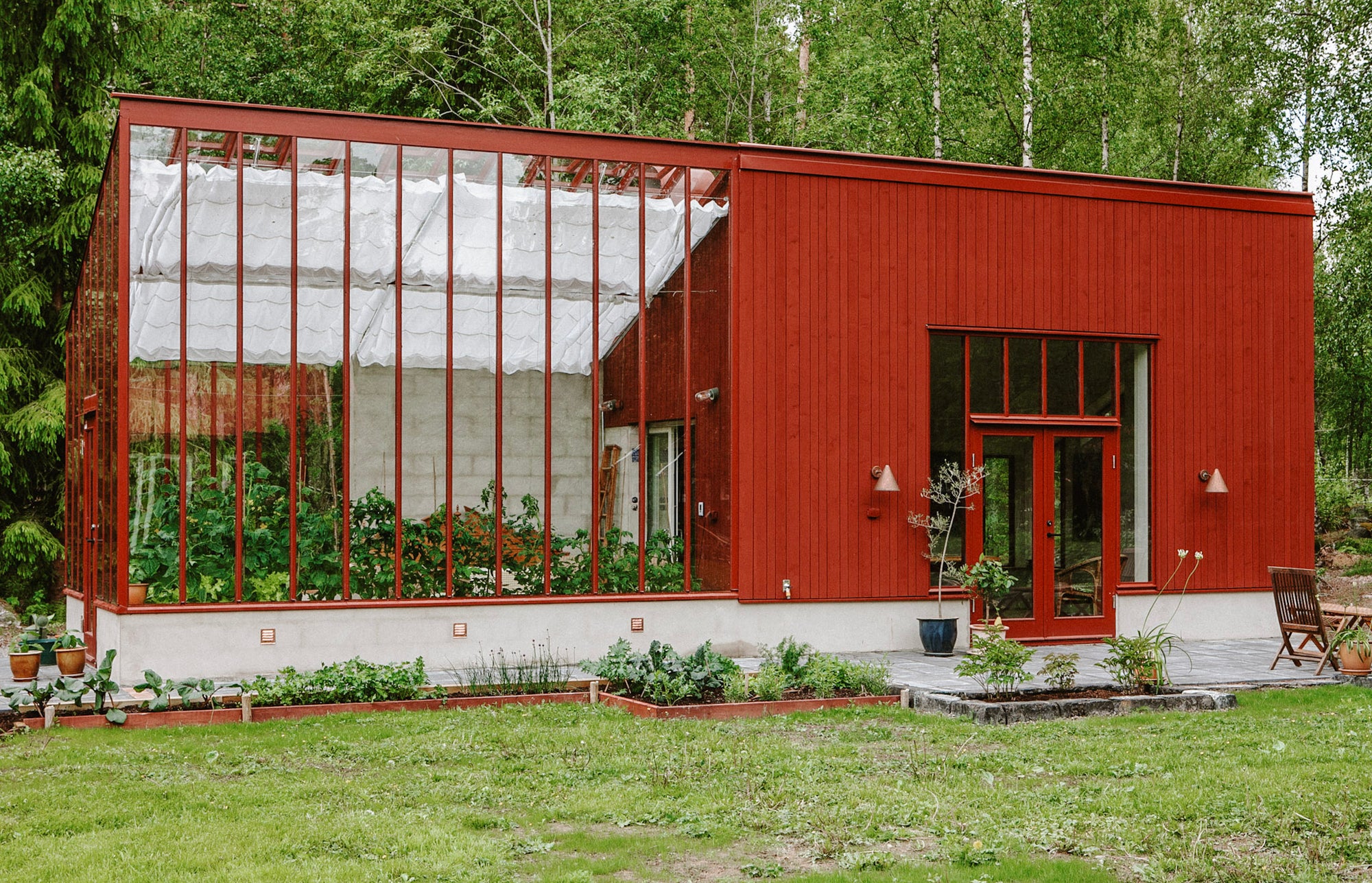 På en skogstomt i Dalarna har två funktioner skapats i en byggnad. Ett orangeri med enkelglas som har integrerats med en isolerad ateljé för året-runt-bruk. Växter och middagsgäster har fått en del, och konstnärsparet har fått en ateljé att skapa i. Under den kalla årstiden värmer kaminen upp både ateljén och växthuset och på sommaren får odlingarna vatten både morgon och kväll från ett automatiskt bevattningssystem.