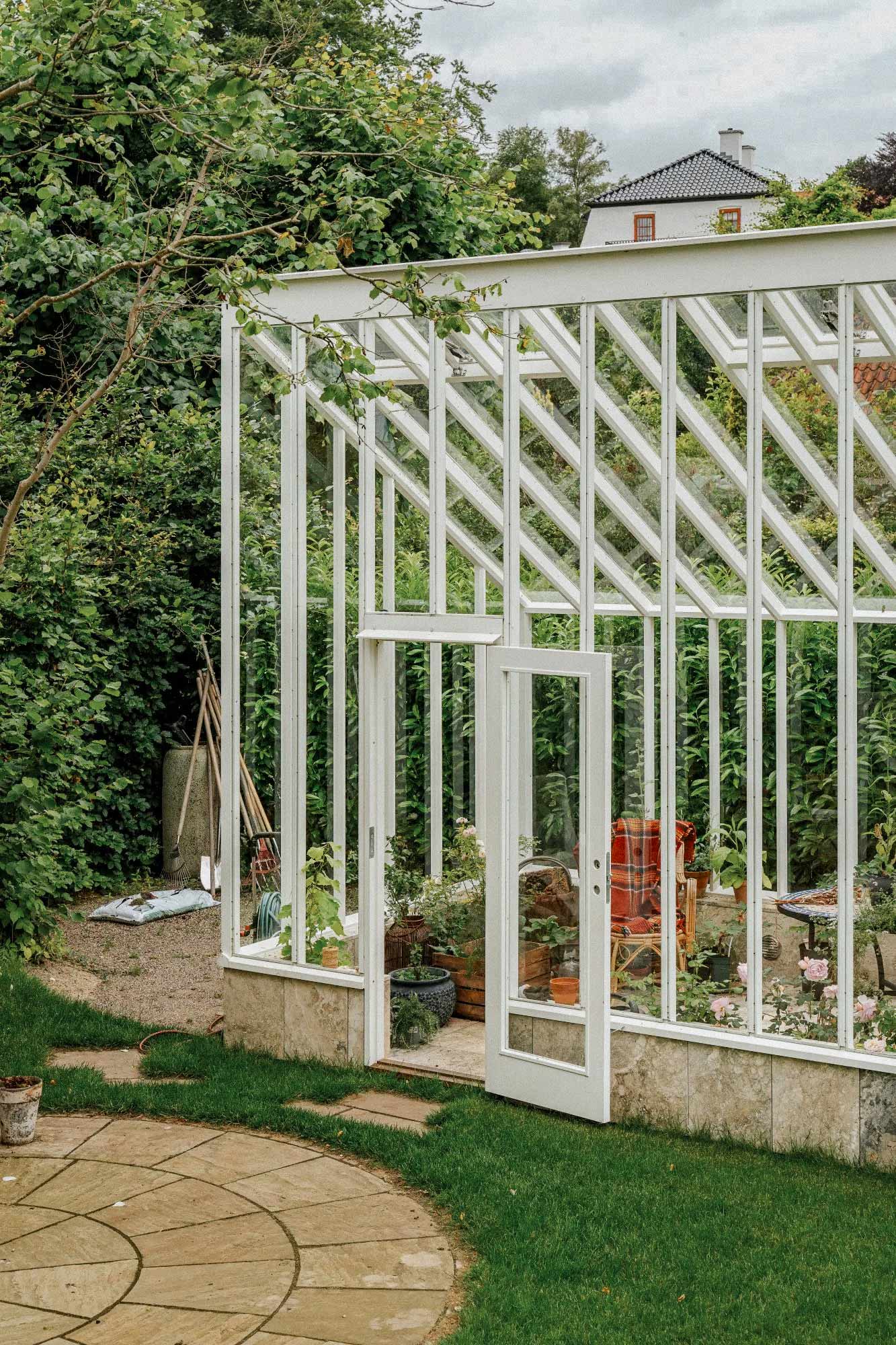 En smuk drivhusdør siger "Velkommen ind!" og skal placeres, så den åbner drivhuset op mod resten af haven. På den måde opløser du grænsen mellem ude og inde, især hvis du vælger dobbeltdøre, så åbningen bliver stor.